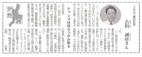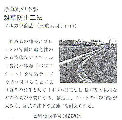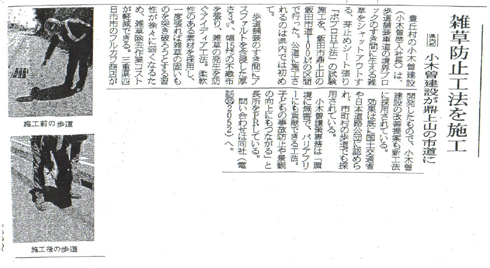 歩道舗装のすき間にアスファルトを含浸した厚さ3ミリ、幅15センチの不織布を張り、雑草の発生を防ぐアイディア工法。柔軟性のある素材を採用し、一度張れば雑草の固いものを突き破ろうとする習性が徐々に弱くなるため、雑草除去作業コストが軽減できる。三重県四日市市のフルカワ商店が開発したもので、小木曽建設の改善提案も新工法に採用されている。