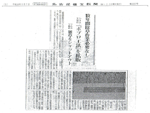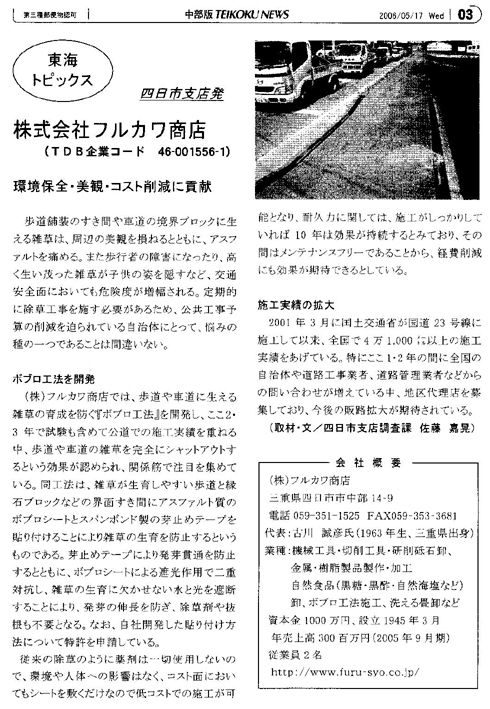 「メーカー展開を考えた結果、行き着いた先は環境産業。知人から『道路にできたすき間から草が生え、管理者の国や自治体の駆除費用がかさんでいる』と聞き、雑草の成長を抑える帯状のシートを貼り付ける『ボブロ工法』を開発した。シートは、アスファルトを染み込ませた不織布とポリエステルのテープの二層構造で、幅十五センチ、厚さ二.八ミリ。長さは調節可能。製造は土木資材メーカーに委託した。種子が入り込むのを防ぐほか、光や水を遮り、発芽も抑える。国や自治体相手に昨年から本格的に販売を始め、八県三十三カ所で使用されている。現在も機械工具や天然塩は扱うが、総売り上げの三割、利益の五割はこの工法。昨年の今ごろは経営が閉塞(へいそく)していたのがうそのように立ち直った」
