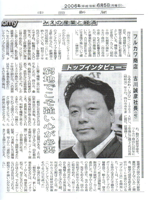 四日市コンビナートは近年、衰退傾向にあり、関係する企業にも影を落としている。機械工具などを扱う一九三九(昭和十四)年創業の商社「フルカワ商店」(四日市市中部)もその影響を受けたが、自然や環境に着目した事業拡大で活路を開いた。古川誠彦社長(42)に生き残り策について聞いた。(榊原崇仁)